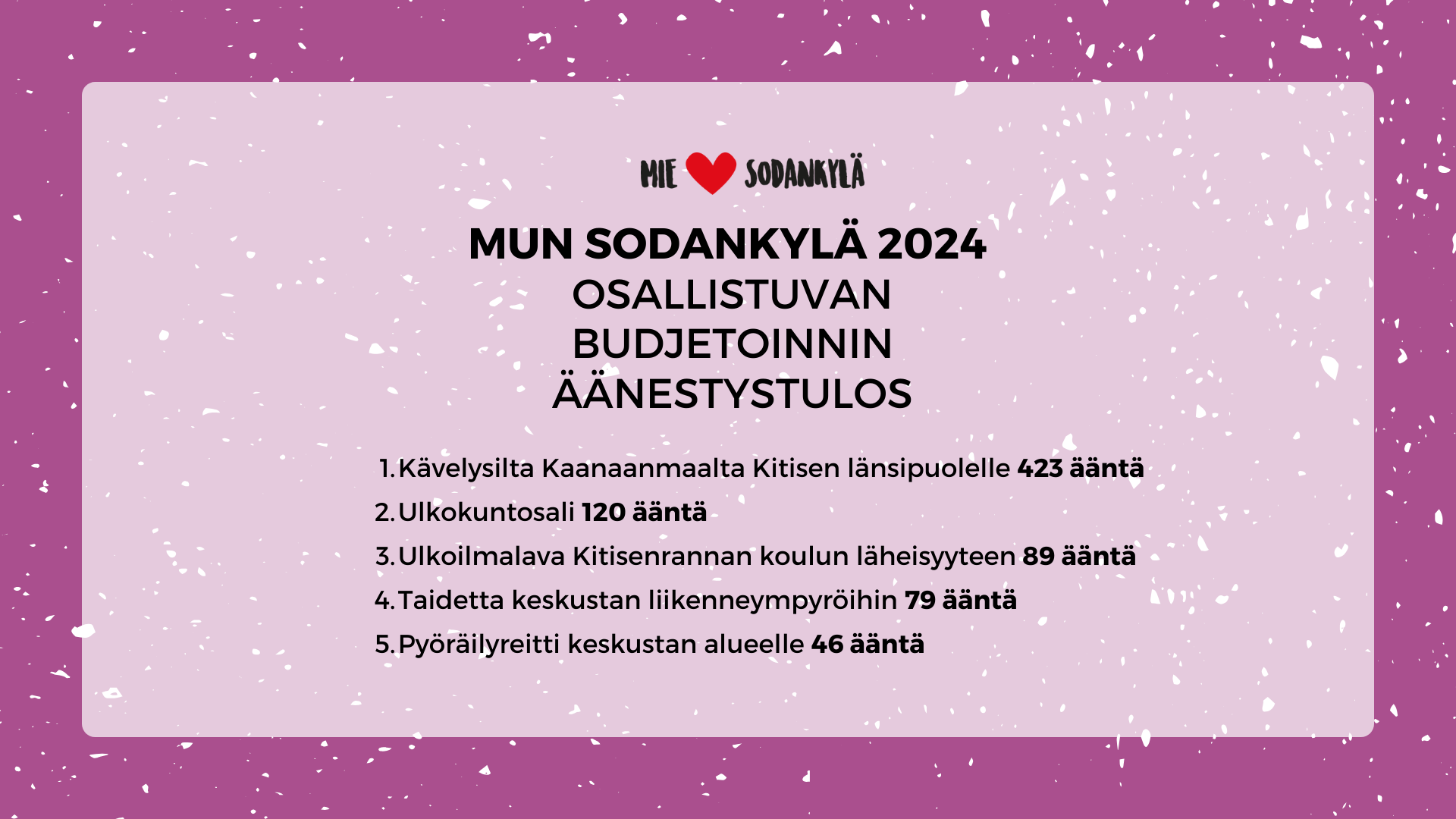 Sodankyläläiset saivat äänestää osallistuvan budjetoinnin kohdetta digitaalisesti Otakantaa.fi-palvelussa sekä paperisilla äänestyslipukkeilla kirjastossa. Otakantaa.fissä ääniä annettiin yhteensä 736, kirjastossa 21. Kokonaisäänimäärä nousi näin 757:ään. Se on 131 ääntä enemmän kuin viime vuonna vastaavassa äänestyksessä.