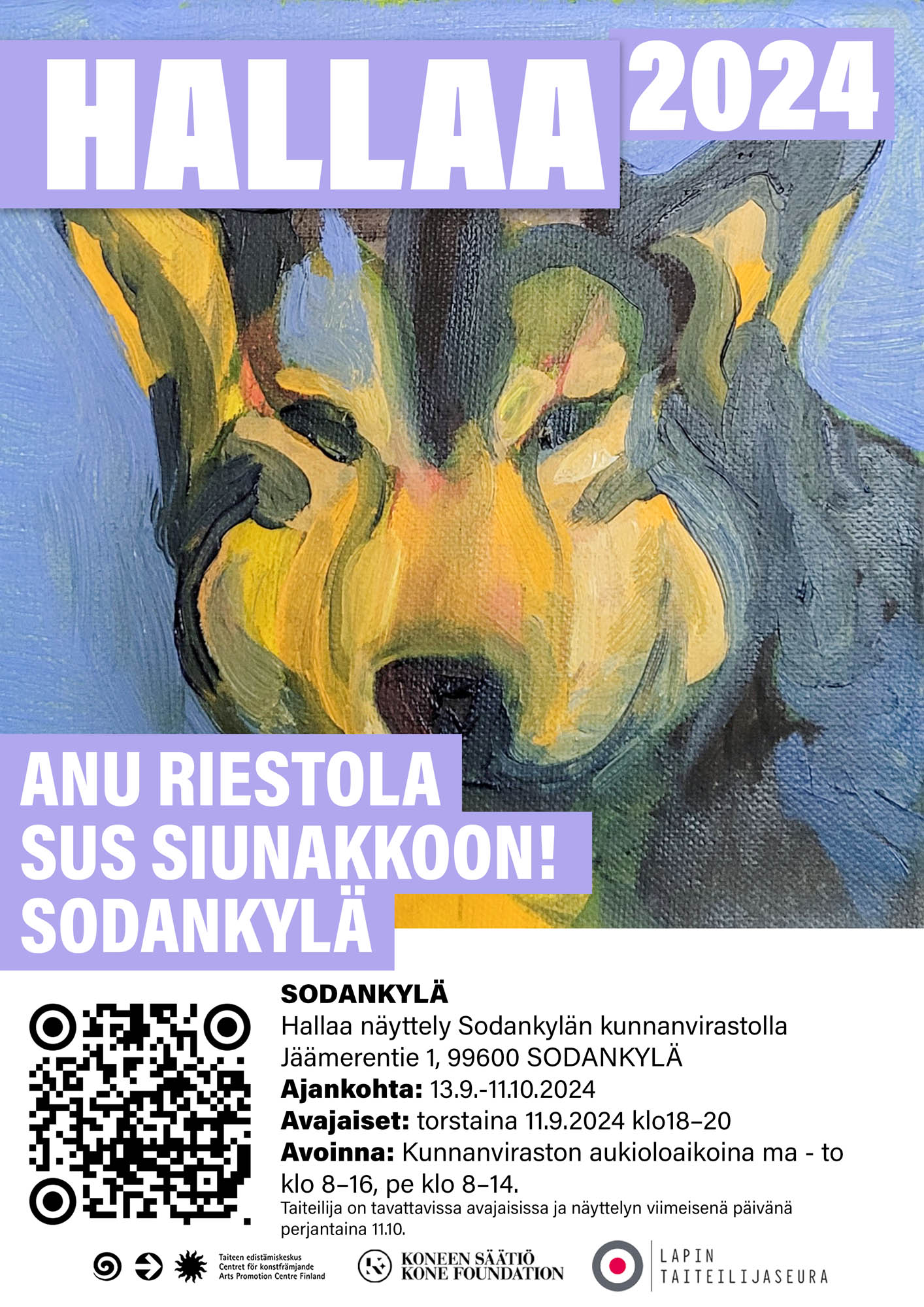 Kemissä asuvan taidemaalari-kuvataitelijan Anu Riestolan taidenäyttely Sus siunakkoon! Sodankylän kunnantalon aulassa käsittelee arvoja, kuten luonnon monimuotoisuutta, ihmisoikeuksia ja erilaisuuden hyväksymistä, joita hän haluaa suojella ja puolustaa. Riestolan töissä yhdistyy maalauksen pintamainen pelkistys ja naturalistinen ilmaisu. Näyttely on osa Lapin taitelijaseuran Hallaa2024-näyttelykokonaisuutta.