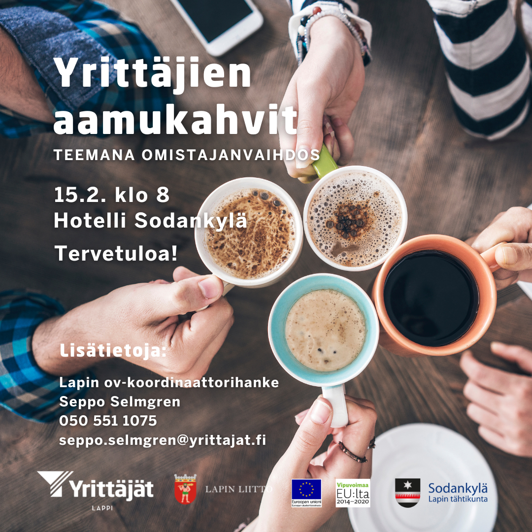 Tulossa jälleen kunnan elinvoimapalvelun ja Sodankylän Yrittäjät ry:n välinen aamukahvitilaisuus. Tilaisuus on kaikille yrityksen omistajanvaihdoksesta kiinnostuneille sekä kaikille yrittäjäyhdistyksen jäsenyyttä harkitseville.